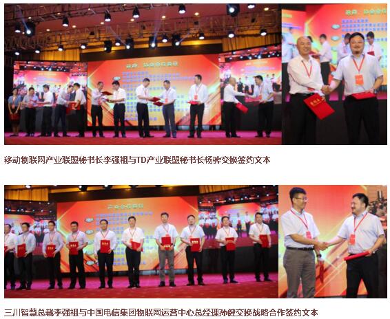 本次大会共同见证了几个历史性的时刻。一为鹰潭市市委副书记、市政府党组书记于秀明为入园注册企业代表发证;二为中国移动物联网产业发展史上一次强有力的握手,战略合作伙伴交换签约文本:作为移动物联网产业联盟秘书长及爱体育平台总裁的李强祖分别与TD产业联盟秘书长杨骅、中国电信集团物联网运营中心总经理孙健上台交换签约文本;三为揭牌仪式:中国信通院院长刘多,鹰潭市委副书记、市政府党组书记于秀明共同为“中国信息通信研究院物联网研究中心(鹰潭)”揭牌;国家信息化专家咨询委员会常务副主任、移动物联网产业联盟理事长周宏仁,国家工信部科技司司长陈因,江西省工信委副主任王亦斌共同为“移动物联网产业联盟”揭牌;国家工信部原党组成员、纪检组长金书波,江西省人民政府副省长李贻煌,鹰潭市市委书记、市长曹淑敏共同为“中国鹰潭移动物联网产业园”揭牌。
